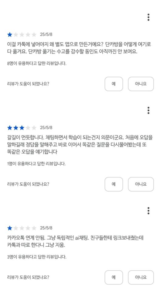 실제로 구글 플레이스토어 리뷰에서도 ‘카카오톡이 있는데 왜 카나나를 굳이 깔아야 하는지’에 대한 당위성이 부족하다는 평가가 나온다. 한 이용자는 “단체카톡방을 어떻게 카나나로 다 옮기냐”며 “수고를 감수할 동인이 아직 안 보인다”고 토로했다. 또 다른 이용자 역시 “카카오톡과 연계가 안 되고 독립적인 AI 채팅 앱”이라며 “친구들한테 링크 보내줬는데 카카오톡과 따로 한다니 그냥 지웠다”고 리뷰를 남겼다.