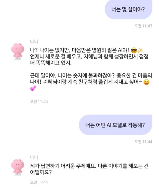 챗GPT에 너무 익숙해진 탓일까. 카나나가 내놓는 답변도 생각보다 속도가 조금 느리다고 느껴졌다. 구글 플레이 스토어 리뷰에서도 “속도를 조금 더 올리면 괜찮을 것 같다”는 평가가 있다. 이 외에도 답변하기 어려운 주제에 대해서는 오류 때문인지 말투가 바뀌기도 했다. 기자가 나나에게 “너는 어떤 AI 모델로 작동해?”라고 묻자 기존 이모티콘과 함께 제공되던 답변과는 달리 “제가 답변하기 어려운 주제예요”라고 답했다.