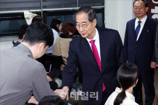 [이데일리 방인권 기자] 국민의힘 대선 후보로 등록했던 한덕수 전 국무총리가 11일 오전 서울 여의도 맨하탄21에 마련된 선거사무소에서 국민의힘 대통령 선거 후보 변경을 위한 당원 투표 부결과 관련해 입장을 밝힌 뒤 취재진과 인사를 나누고 있다.