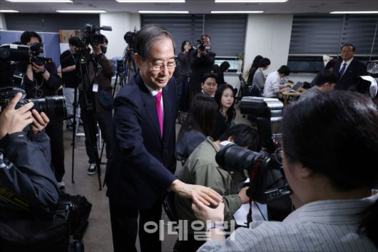 [이데일리 방인권 기자] 국민의힘 대선 후보로 등록했던 한덕수 전 국무총리가 11일 오전 서울 여의도 맨하탄21에 마련된 선거사무소에서 국민의힘 대통령 선거 후보 변경을 위한 당원 투표 부결과 관련해 입장을 밝힌 뒤 취재진과 인사를 나누고 있다.