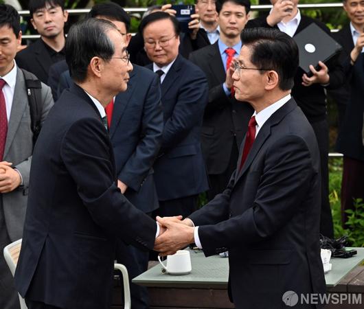 [서울=뉴스핌] 신정인 기자 = 김문수 국민의힘 대선 후보는 11일 대선 후보 등록을 마친 뒤 한덕수 전 국무총리와 만나 선거대책위원장직을 제안했다. 한 전 총리는 "실무적으로 적절한지 논의를 하는 게 좋겠다"며 즉답을 피했다.