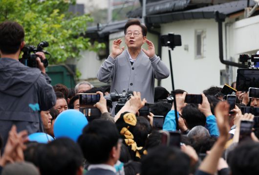 민심을 청취하는 '경청 투어'에 나선 더불어민주당 이재명 대선후보가 11일 전남 화순군 화순읍 인근 거리에서 연설을 하고 있다. 뉴시스 |