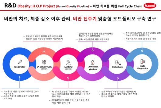 한미약품이 본격적으로 비만치료제 개발에 나선 시기는 2023년 9월이다. 'H.O.P(Hanmi Obesity Pipeline)' 프로젝트를 중심으로, 한미약품의 독자 플랫폼 기술 '랩스커버리'를 적용해 '신개념 비만치료제'를 디자인했다. 이 신개념 비만치료제의 초점은 바로 △근육량 보존 △한국인 맞춤형이라는 점에서 개발 단계에서부터 남다른 경쟁력으로 주목을 받고 있다.