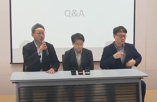 11일 SKT 유심 해킹 사고 관련 일일 브리핑에서 김희섭(왼쪽부터) SKT PR센터장, 임봉호 MNO사업부장, 류정환 네트워크인프라센터장이 질의응답을 받고 있는 모습. [SKT 데일리 브리핑 중계 화면 캡처] |
