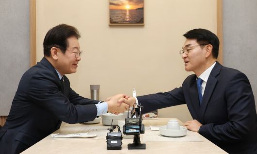 지난 2월21일 당시 더불어민주당 이재명 대표와 박용진 전 의원이 서울 여의도의 한 식당에서 오찬회동 중 악수하고 있다. 연합뉴스 |