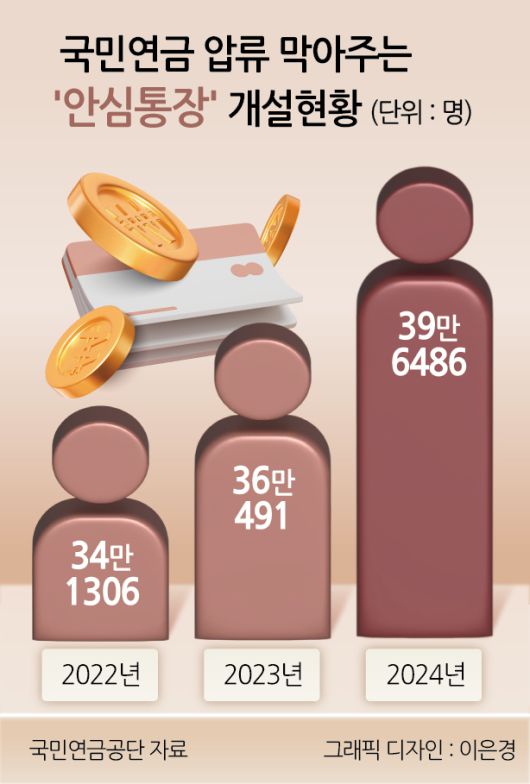11일 국민연금공단을 통해 최근 3개년치 국민연금급여 수급 전용계좌(안심통장) 가입자 현황을 살펴본 결과, 2022년 말 34만1306명에서 2023년 말 36만491명, 2024년 말에는 39만6486명으로 매년 꾸준히 늘었다. 2023년 가입자 35만명을 넘어선 뒤 약 2년 만에 5만여명이 증가하면서 연내 40만명도 돌파할 전망이다.