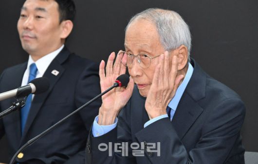 [이데일리 방인권 기자] 윤여준 더불어민주당 총괄상임선거대책위원장이 11일 서울 여의도 민주당사에서 기자회견을 열고 선거 전반에 대한 민주당의 기조를 밝히고 있다.