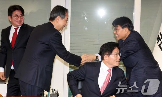 (서울=뉴스1) 이광호 기자 = 한덕수 전 국무총리가 11일 서울 여의도 국민의힘 대선후보 사무실에 들어서며 관계자들과 인사를 나누고 있다. (공동취재) 2025.5.11/뉴스1pjh2580@news1.krCopyright ⓒ 뉴스1. All rights reserved. 무단 전재 및 재배포, AI학습 이용 금지.