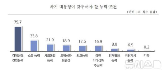 조사 결과 응답기업 75.7%가 차기 대통령이 갖추어야할 능력·조건으로 '경제성장 견인능력'을 꼽아, 경제분야에서의 능력을 대통령 자질로 가장 중요시하는 것으로 나타났다.