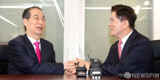 [서울=뉴스핌] 양윤모 기자 = 김문수 국민의힘 대선후보가 11일 오전 국민의힘 당사에서 열린 한덕수 전 국무총리와 회동하며 손을 잡고 있다. 국민의힘은 10일 김문수 대선 후보를 한덕수 후보로 교체하는 찬반을 묻는 전 당원 투표결과, 반대 의견이 찬성보다 많아 부결됐다고 밝혔다. [공동취재] 2025.05.11 yym58@newspim.com