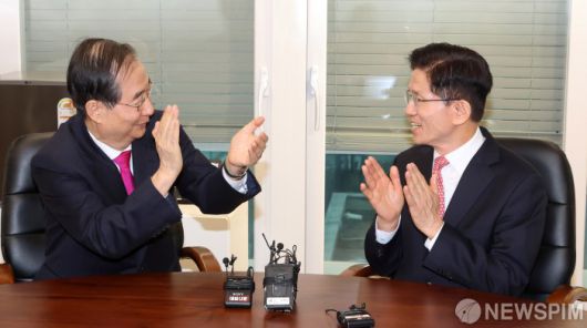 [서울=뉴스핌] 양윤모 기자 = 김문수 국민의힘 대선후보가 11일 오전 국민의힘 당사에서 열린 한덕수 전 국무총리와 회동 서로에게 박수를 보내고 있다. 국민의힘은 10일 김문수 대선 후보를 한덕수 후보로 교체하는 찬반을 묻는 전 당원 투표결과, 반대 의견이 찬성보다 많아 부결됐다고 밝혔다. [공동취재] 2025.05.11 yym58@newspim.com |
