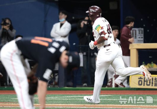[서울=뉴시스] 정병혁 기자 = 지난 9일 서울 구로구 고척스카이돔에서 열린 2025 KBO리그 한화 이글스 대 키움 히어로즈의 경기, 4회말 무사 주자없는 상황 키움 푸이그가 솔로 홈런을 친 뒤 그라운드를 돌고 있다. 2025.05.09. jhope@newsis.com