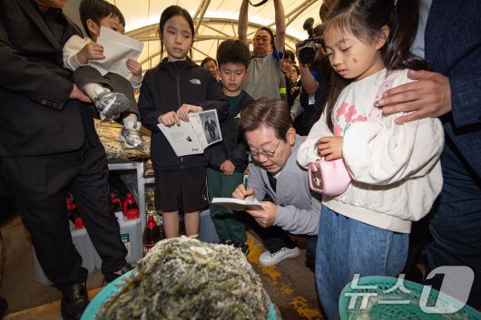 (강진=뉴스1) 이재명 기자 = 경청투어에 나선 이재명 더불어민주당 대통령 후보가 11일 오전 전남 강진군 강진시장에서 어린이의 요청으로 책에 사인하고 있다. 2025.5.11/뉴스12expulsion@news1.krCopyright ⓒ 뉴스1. All rights reserved. 무단 전재 및 재배포, AI학습 이용 금지.