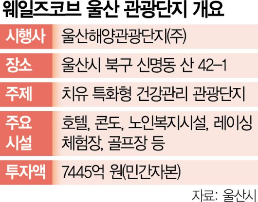 웨일즈코브 울산 관광단지는 가족중심의 체류형 관광수요 수용을 목표로 총면적 150만 6000㎡의 부지에 전액 민간자본 7445억 원이 투입될 예정이다.
