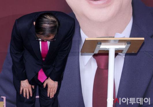 아시아투데이 이병화 기자 = 국민의힘 대선후보로 등록했던 한덕수 전 국무총리가 11일 서울 여의도 캠프 사무실에서 국민의힘 대통령 후보 변경을 위한 당원 투표가 부결된 것과 관련해 입장을 밝히기 위해 들어서며 인사하고 있다. ⓒ "젊은 파워, 모바일 넘버원 아시아투데이"