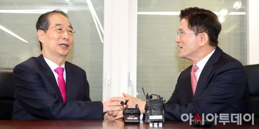 아시아투데이 이병화 기자 = 김문수 국민의힘 대선후보와 한덕수 전 국무총리가 11일 서울 여의도 국민의힘 대선후보 사무실에서 회동을 하고 있다. ⓒ "젊은 파워, 모바일 넘버원 아시아투데이"