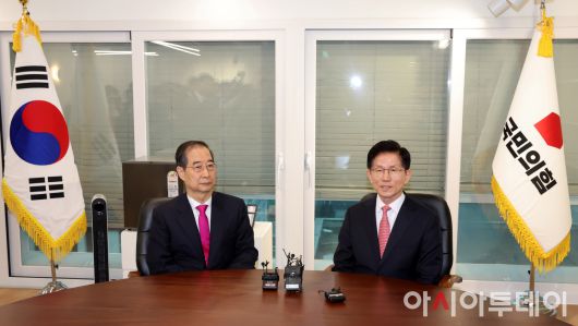 아시아투데이 이병화 기자 = 김문수 국민의힘 대선후보와 한덕수 전 국무총리가 11일 서울 여의도 국민의힘 대선후보 사무실에서 회동을 하고 있다.