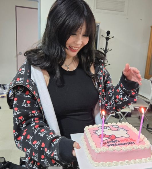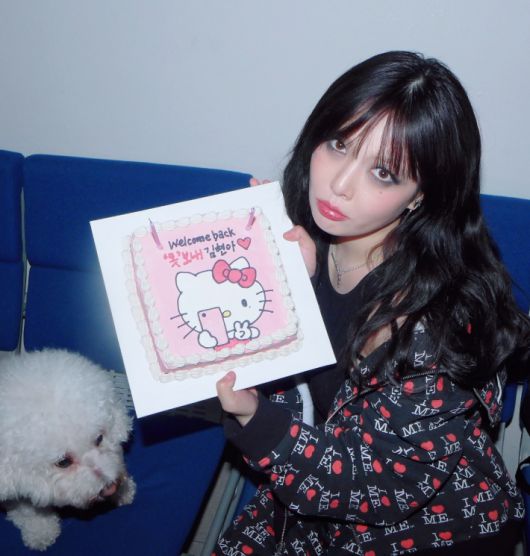 'Welcome back 못 보내 김현아'라는 문구가 적힌 케이크를 들고 환히 웃으며 인증 사진을 찍었다.