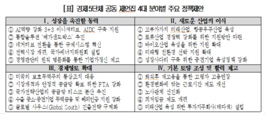 AI와 탄소중립 시대를 맞아 산업경쟁력의 핵심이 될 에너지 분야의 정책 전환에 대한 요구도 있었다. 제언집은 조속한 전력망 확충을 위한 개발이익 주민공유제, 분산에너지 활성화를 위한 차등요금제 등 분산전원 시스템 조성, 분산에너지 특구 내 전기요금 감면 및 요금제 다양화 등 인센티브 제공, 에너지산업 전체를 관장하는 대통령 직속 국가에너지위원회 설치 등을 주문했다.