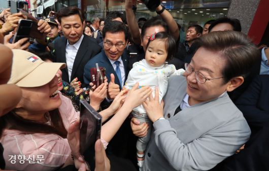 이재명 더불어민주당 대선 후보가 11일 전남 화순군 화순읍 중앙로 인근에서 한 어린이를 안아주고 있다. 박민규 선임기자 |
