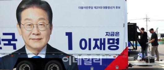 [이데일리 방인권 기자] 제21대 대통령 선거 공식 선거운동을 하루 앞둔 11일 경기도 양주시의 한 차량광고업체에서 관계자들이 이재명 더불어민주당 대통령 후보 선거운동 유세차량을 제작하고 있다.