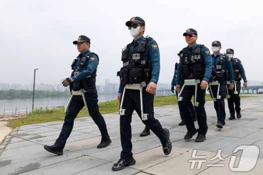 11일 서울 여의도 한강공원에서 서울경찰청 기동대원들이 웨어러블 로봇을 착용하고 순찰을 돌고 있다. 2025.5.11/뉴스1 ⓒ News1 이승배 기자 |