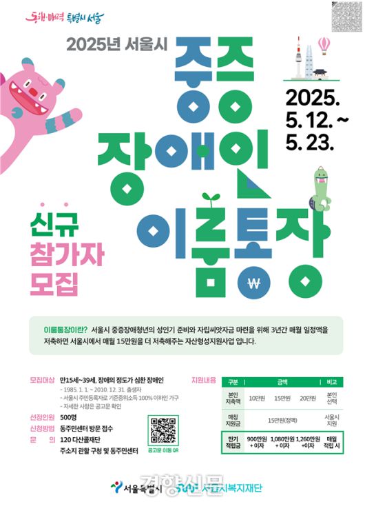서울시는 중증장애청년의 경제적 부담을 덜고, 자립기반을 마련할 수 있는 ‘이룸통장’사업 참가자를 모집한다고 11일 밝혔다.
