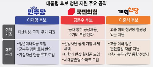 이재명 더불어민주당 대선후보는 자산 형성, 구직 지원, 주거 지원 등을 약속했다. 자산 형성을 위해서는 '청년내일채움공제 시즌2'로 청년미래적금을 도입한다. 가상자산을 제도권으로 끌어들이기 위해 가상자산 현물 ETF를 도입하고 통합감시시스템을 구축해 안전한 투자 환경을 조성하는 게 골자다.