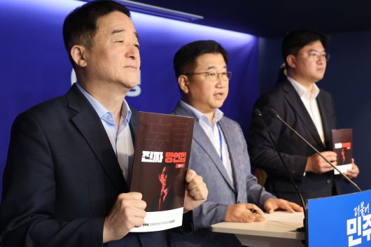 더불어민주당 선대위 신속대응단장 강득구 의원 등이 11일 서울 여의도 당사에서 국민의힘 김문수 대선 후보 망언집 공개 관련 브리핑을 하고 있다. <연합> |