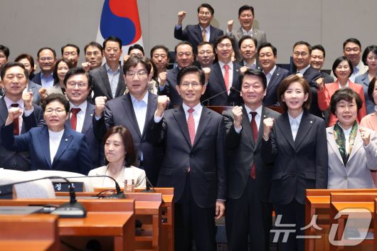 (서울=뉴스1) 이광호 기자 = 김문수 국민의힘 대통령 후보와 권성동 원내대표를 비롯한 의원들이 11일 오후 서울 여의도 국회에서 열린 의원총회에서 파이팅을 외치며 기념촬영을 하고 있다. 2025.5.11/뉴스1