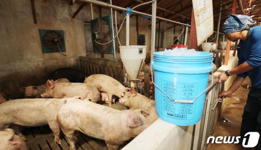 제주 지역에 폭염이 이어지고 있는 19일 오전 제주시 한림읍 금악리 한 양돈장에서 더위를 식히기 위한 얼음을 사료통에 배급하고 있다.2020.8.19/뉴스1 ⓒ News1 오현지 기자 |