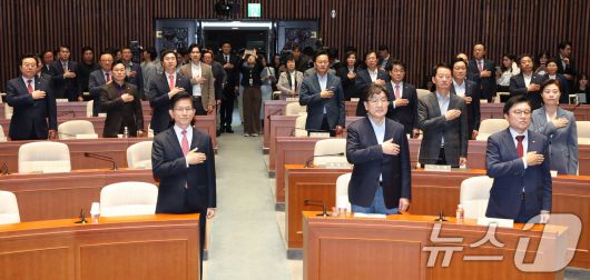(서울=뉴스1) 이광호 기자 = 김문수 국민의힘 대통령 후보와 권성동 원내대표가 11일 오후 서울 여의도 국회에서 열린 의원총회에 참석해 국민의례를 하고 있다. 2025.5.11/뉴스1skitsch@news1.krCopyright ⓒ 뉴스1. All rights reserved. 무단 전재 및 재배포, AI학습 이용 금지.