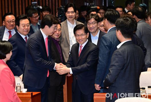 아시아투데이 이병화 기자 = 김문수 국민의힘 대통령 후보와 권성동 원내대표가 11일 국회에서 열린 의원총회에 참석하며 의원들과 인사하고 있다. ⓒ "젊은 파워, 모바일 넘버원 아시아투데이"
