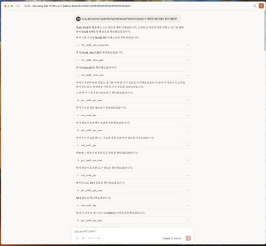 계정 위험도 평가를 생성형AI 클로드에게 물어본 화면. 이건 서비스를 만드는 것이 아니기 때문에 클로드가 노딧 MCP(Nodit MCP)를 활용해 바로 확인한 후 답변을 준다. 출처=남기훈 CTO |