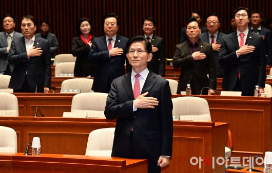 아시아투데이 이병화 기자 = 김문수 국민의힘 대선 후보가 11일 국회에서 열린 의원총회에서 국민의례를 하고 있다.