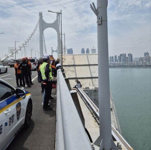11일 형제복지원 피해생존자인 최승우씨가 부산 광안대교 상판에 올라가 고공 농성을 하고 있다. 부산경찰청 제공 |