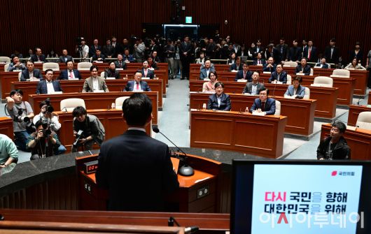 아시아투데이 이병화 기자 = 김문수 국민의힘 대통령 후보가 11일 국회에서 열린 의원총회에서 발언을 하고 있다.