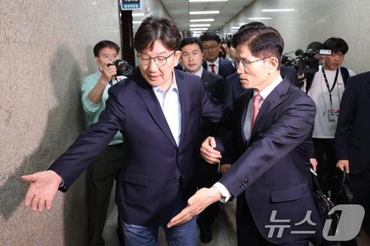 (서울=뉴스1) 이광호 기자 = 김문수 국민의힘 대통령 후보와 권성동 원내대표가 11일 오후 서울 여의도 국회에서 열린 의원총회를 마치고 원내대표실로 들어가고 있다. 2025.5.11/뉴스1skitsch@news1.krCopyright ⓒ 뉴스1. All rights reserved. 무단 전재 및 재배포, AI학습 이용 금지.
