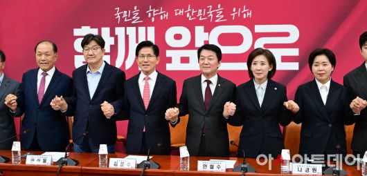 아시아투데이 이병화 기자 = 김문수 국민의힘 대통령 후보와 공동선대위원장들이 11일 국회에서 열린 중앙선거대책위원회 회의에 앞서 손을 맞잡고 있다. 왼쪽부터 황우여, 권성동 공동선대위원장, 김 후보, 안철수, 나경원, 양향자 공동선대위원장. ⓒ "젊은 파워, 모바일 넘버원 아시아투데이"