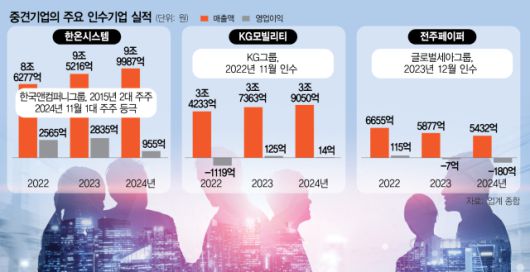 11일 투자은행(IB)업계에 따르면 한국타이어앤테크놀로지, KG, 글로벌세아, 호반, 타이어뱅크 등 주요 중견기업 5곳이 지난 2018년부터 5년간 5조 6921억 원을 투자해 한온시스템 등 15개 기업을 인수했으나 이 중 8개 기업이 적자와 상장폐지 위기, 회생신청 등 저조한 실적을 나타내고 있다. 업계에서는 이들 중견 그룹이 대규모 인수를 통해 일단 사세를 키우는데는 성공했지만 이후 견실한 경영을 하고 있는 지에는 의문을 제기한다.