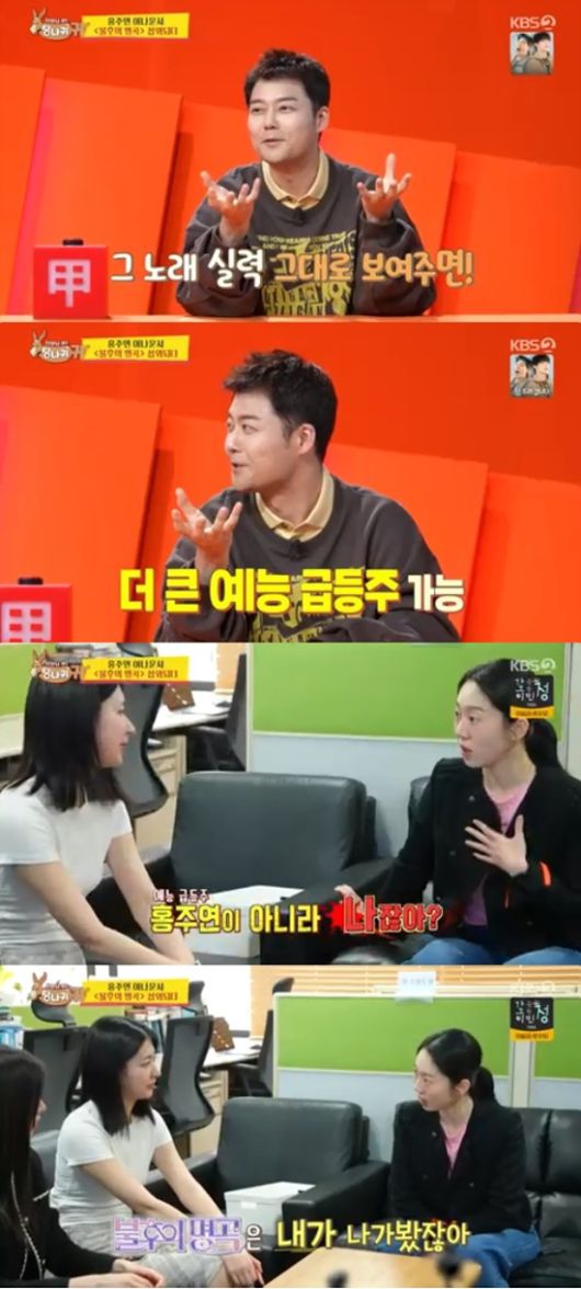 이날 엄지인은 홍주연이 '불후의 명곡' 예능 급등주 특집에 섭외된 사실을 알고 놀랐다. 홍주연이 앞서 음치, 박치의 모습을 보여줬기 때문.