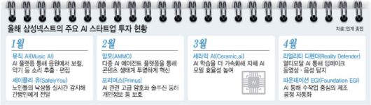 삼성은 이외에 △암모(다중 AI 에이전트 플랫폼 통한 콘텐츠 생태계 혁신) △프리머스(AI 관련 고급 암호화 솔루션 통해 개인정보 등 보호) △세라믹 AI(AI 학습을 더 가속화해 자체 AI 모델 효율성 증대) △리얼리티 디펜더(멀티모달 AI 통해 딥페이크 동영상·음성 탐지) 등에 투자했다. 산업계 한 관계자는 “삼성의 AI 투자를 보면 미래 AI가 산업계에서 얼마나 광범위하게 쓰일지 짐작할 수 있다”고 했다.