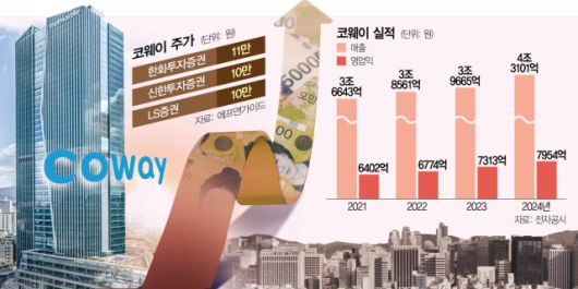 11일 금융감독원 전자공시시스템에 따르면 코웨이는 지난해 연결 기준 매출 4조 3101억 원, 영업이익 7954억 원을 기록했다. 이는 전년 대비 각각 8.7%, 8.8% 증가한 수치로, 창사 이래 최초로 연 매출 4조 원을 넘어섰다. 2019년 인수 당시와 비교하면 매출은 약 43%, 영업이익은 약 74% 증가했다. 5년 만에 연 매출을 1조 원 이상 끌어올린 것이다. 올 1분기 매출 및 영업익도 역대 최대 분기 실적을 기록하며 견조한 성장세를 이어가고 있다.