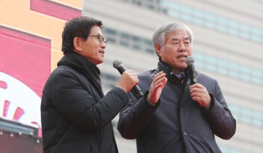 전광훈 목사(오른쪽)와 김문수 전 장관이 지난 2019년 12월 25일 오후 서울 종로구에서 열린 '2019 자유 대한민국 전국 연합 성탄축제'에서 발언하고 있다. 연합뉴스 |