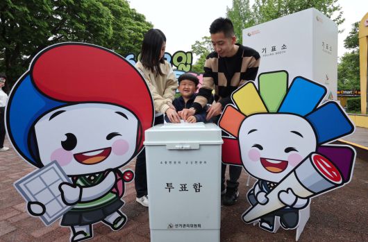 제21대 대통령선거 선거운동 시작 전날인 11일 서울 어린이대공원에서 열린 투표 캠페인에서 한 가족이 투표 체험을 하고 있다. 한주형 기자 |