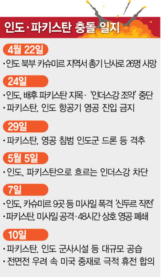 ‘사실상 핵보유국’인 인도와 파키스탄이 무력 충돌을 벌인 지 사흘 만에 미국 등 국제사회의 중재로 전격 휴전에 합의했다. 그러나 국경선 인근에서는 여전히 폭발음이 들리고 양국이 서로를 향해 휴전협정 위반을 주장하는 등 긴장은 가라앉지 않고 있다.