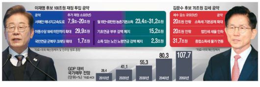 대선 후보들의 무차별적인 포퓰리즘 공약이 나라 곳간을 위협하고 있다. 이재명 더불어민주당 대선 후보 공약을 모두 실현하려면 임기 중 100조원의 재정이 투입돼야 한다. 김문수 국민의힘 후보의 감세 공약이 시행되면 임기 5년간 70조원의 세수 공백이 생긴다.