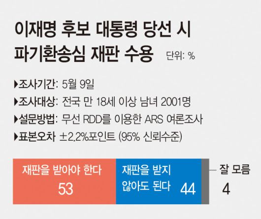 아시아투데이가 한국여론평판연구소(KOPRA)에 의뢰해 지난 9일 전국 만 18세 이상 남녀 2001명을 대상으로 실시한 '대통령 당선 시 파기환송심 재판 수용' 여론조사 결과에 따르면, '만약 이재명 후보가 대통령으로 당선된다면 6월 18일로 연기한 공직선거법 파기환송심 재판을 받아야 한다고 생각하나, 받지 않아도 되나'라는 질문에 응답자 53%가 '재판을 받아야 한다'고 답했고, 44%는 '재판을 받지 않아도 된다'고 응답했다. 4%의 '잘 모른다'는 답변도 있었다.
