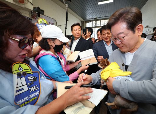 남도문화벨트 골목골목 경청투어에 나선 이재명 더불어민주당 대선 후보가 11일 전남 강진군 강진읍 강진오감통시장을 찾아 한 지지자의 반려견을 품에 안고 사인을 하고 있다. /연합 |