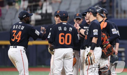 한화 선수들이 11일 서울 구로구 고척스카이돔에서 열린 '2025 신한 SOL뱅크 KBO리그' 한화 이글스와 키움 히어로즈의 경기에서 8-0으로 승리한 후 하이파이브를 하고 있다. 2025.5.11/뉴스1 ⓒ News1 김성진 기자 |